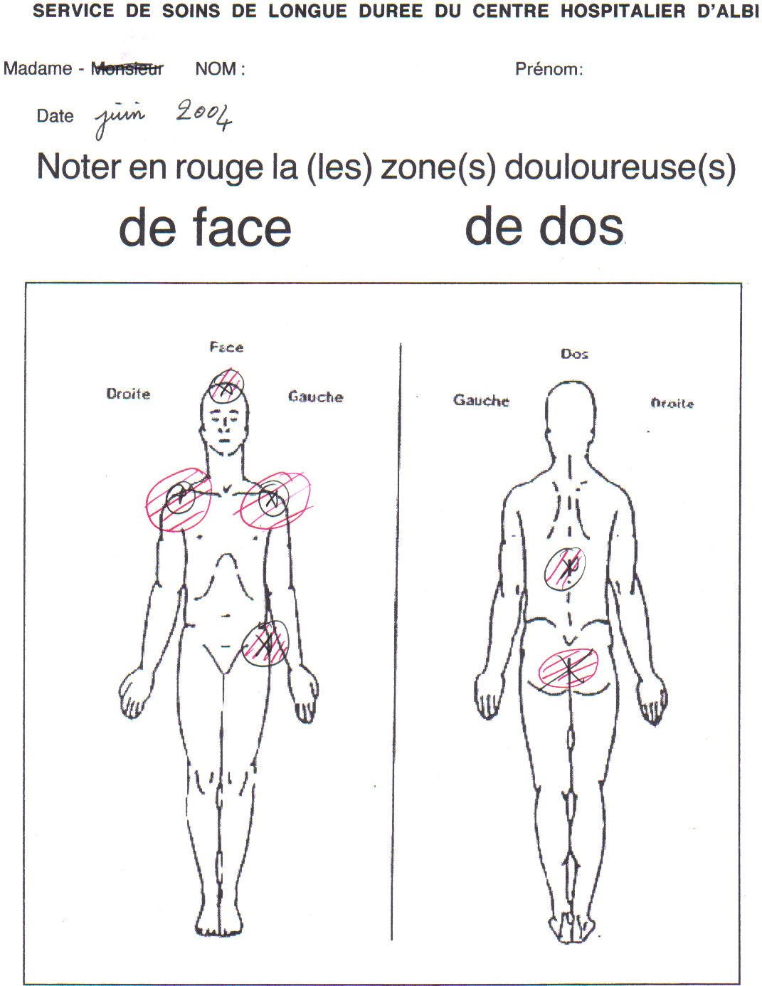 Commentaires : le "bonhomme" permet de visualiser instantanément la ou les localisation(s) douloureuse(s) chez la personne âgée. Cette représentation schématique était utilisée dans notre service depuis le mois de décembre 1998 dès qu'une localisation douloureuse était diagnostiquée.