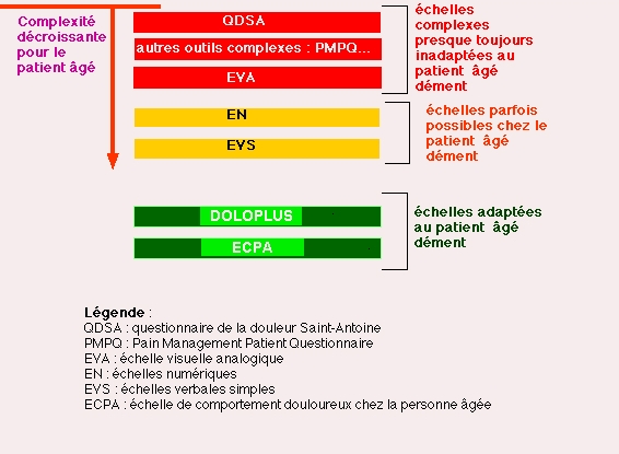 Les échelles "unidimensionnelles" peuvent convenir à la pathologie douloureuse aiguë du sujet non dément, par exemple en période postopératoire. Chez le patient dont les fonctions cognitives sont dégradées, seules les deux dernières,