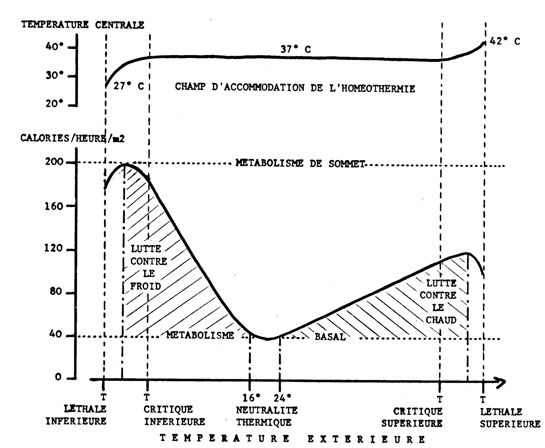 Sur les graphiques ci-dessous, il est aisé de voir que les êtres humains sont des homéothermes qui maintiennent leur température interne entre deux limites qualifiées de températures critiques. Au delà de ces limites, l'organisme ne peut plus conserver la température habituelle. A l'extrême, l'agression thermique provoque la mort : ce sont les températures léthales (ou létales). En dehors de la neutralité thermique, l'organisme met en jeu des mécanismes de défense qui entraînent une augmentation de son métabolisme jusqu'à un métabolisme qualifié "de sommet" dans la lutte contre le froid.